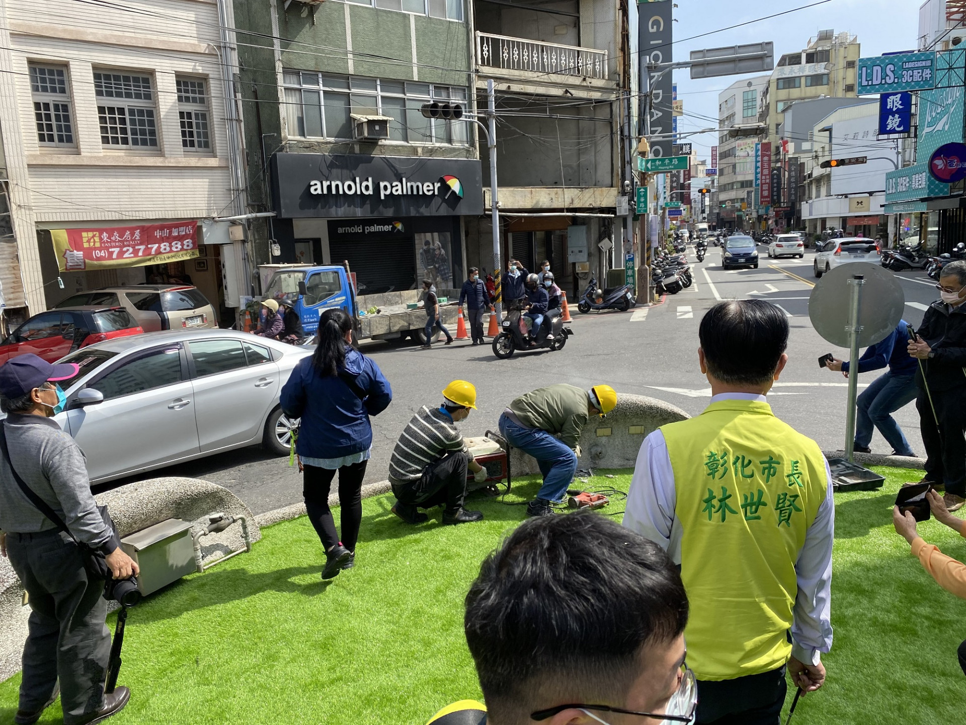 小編經過彰化市三角公園圓環,現場對圓環修整正召開記者會,幸運的親臨現場取景,現場有彰化市長、市政府相關單位、施工單位及各大新聞媒體記者。這個彰化市人譏笑為最醜的圓環公共藝術"蓮花燈塔"再次施工修改!