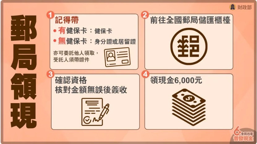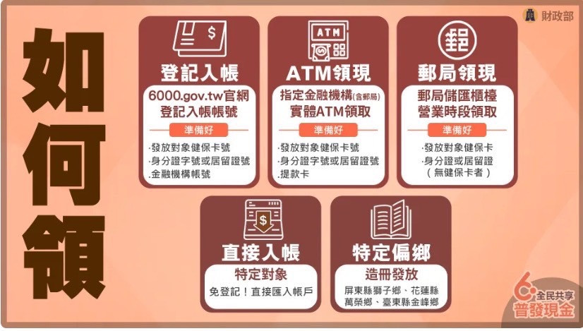 財政部並表示,後續陸續開放「ATM領現」及「郵局領現」作業,另「直接入帳」及「造冊發放」方式,將由政府協助辦理;預計今年3月20日至25日開始進行偏鄉地區(屏東縣獅子鄉、花蓮縣萬榮鄉及東縣金峰鄉)造冊,民眾得到當地派出所登記。財政部表示,領取方式多元且時間充裕,民眾可選擇適合自己的方式領取。