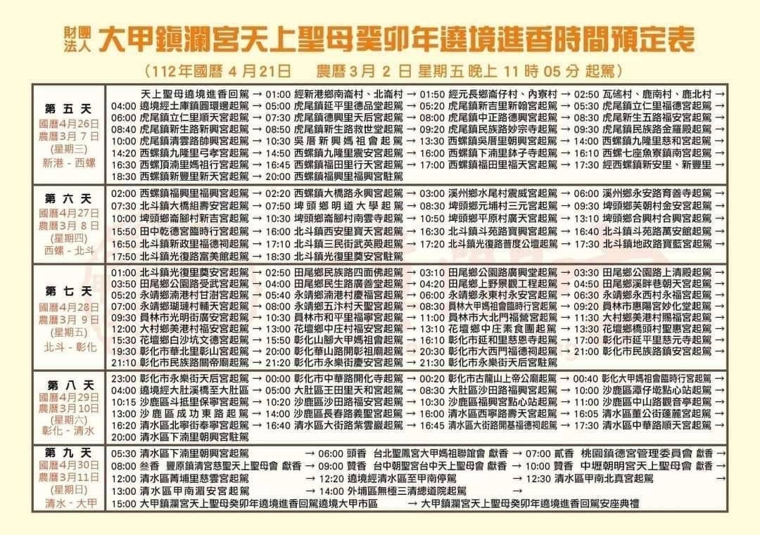 歲次癸卯年,大甲媽遶境進香時程圖。(圖/大甲鎮瀾宮提供)
